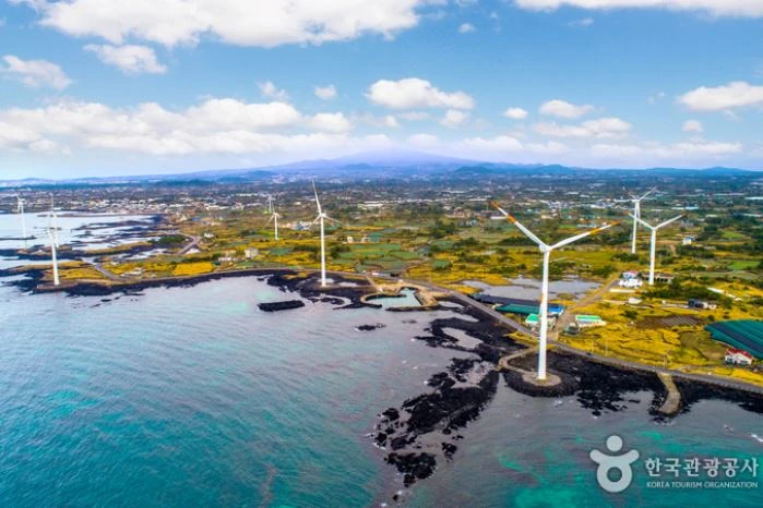 제주도 서쪽 끝을 따라 연결된 신창 풍차 해안도로는 해상풍력단지가 조성되어 있어 해안도로를 따라 줄지어 서 있는 풍차를 만날 수 있다. 구불구불 해안선을 따라 보이는 하얀 풍차와 에메랄드빛 바다는 우리에게 상쾌한 가을 풍경을 보여준다. 자료출처 : 대한민국 구석구석(http://korean.visitkorea.or.kr) 펜션에서 차량으로 약 15분, 10.9km